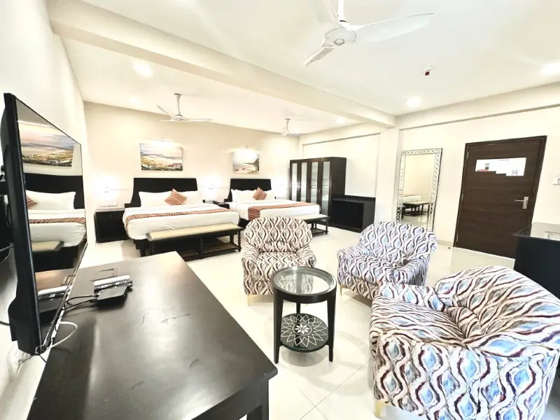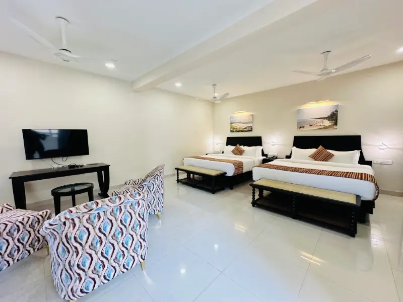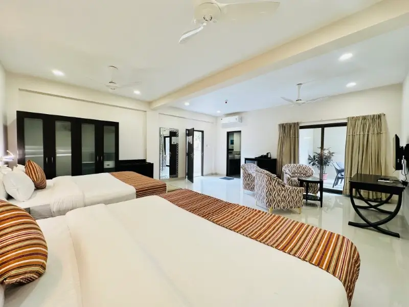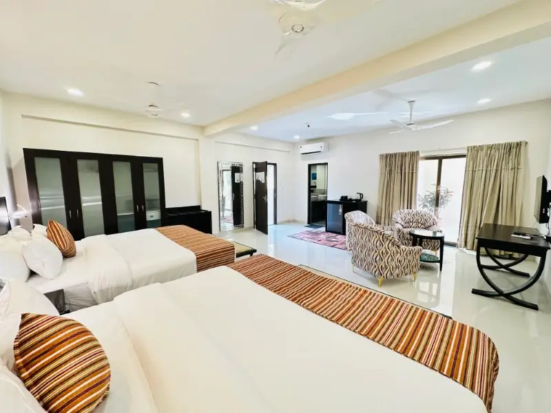 Our Luxurious Suites offers a spacious balcony which allows guests to sit back, relax and enjoy views of our Lush gardens and pool and boast of 2 King beds, a sit out area, desk, high speed Wi-Fi, television, telephone, wardrobe, tea and coffee making facilities , iron and an ensuite bathroom fitted with a Jacuzzi , a rain shower with hot and cold water facilities ,toiletries and 2 sinks….perfect for a family.